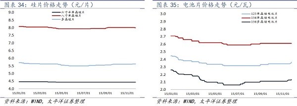 2015年上半年,由于需求不振,光伏厂商积累大量库存,致使光伏各类产品价格下移,行业竞争加剧。在价格不断下行的压力之下,厂商为了保持利润水平,寻求先进的生产工艺以求降低生产成本,提高效率。在晶硅切片技术方面,国内厂商逐步开始引入金刚线切割技术,特别是单晶硅片企业,已经基本完成了技术转型,使非硅成本极速下降。而在电池技术方面,国内一线厂商积极引入高效的PERC技术应用于电池片的生产,使电池的光电转换率得到进一步的提升。目前国内的单晶电池和组件的一般转换率已经分别达到25.6%和22.9%,明显高于多晶电池和组件的20.8%和18.5%。而下半年,由于光伏市场的回暖需求回升,光伏各产品价格相应有所企稳回升。多晶的价格回升幅度明显大于单晶,两者的价差逐步缩减。单晶高转换率的优势和与多晶价差的缩小是我们认为需求终端企业未来会考虑选择单晶的第一个原因。