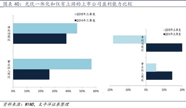 2015年,光伏行业产业链进一步整合,光伏上中游企业积极涉足和布局下游光伏电站的建设和运营。建筑装饰、农渔等外围上市公司也逐步进入光伏电站的收购和建设中来,进一步外延其主营业务链条,加强主营业务和光伏电站的深度融合,提升未来盈利能力。我们收集38家重点光伏上市公司,涉及光伏上中下游产业链,对比分析了2014年三季度和2015年三季度上中下游产业链各环节和产业链一体化公司的营收和净利的相关情况,发现光伏产业链盈利能力中枢逐步下移。我们看好两种盈利模式:一种是光伏上下游产业一体化模式;一种是纯光伏电站运营模式。