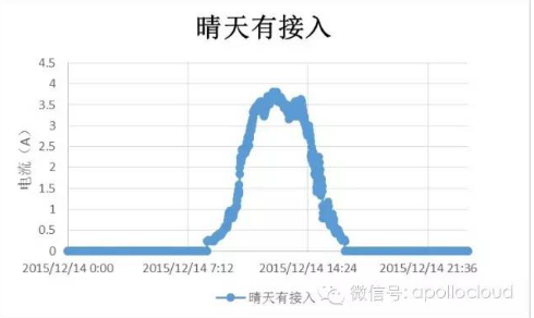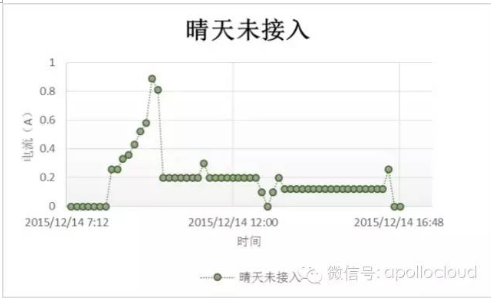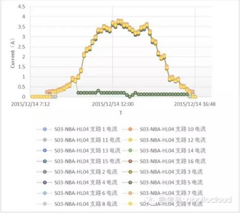 操千曲而后晓声,观千剑而后识器。看过大量的电流图像之后,我们发现,所有的接入的支路的电流形态是一个抛物线,在晴天的时候,连续而饱满。这是由于太阳在一天的时间内,日出,正午,日落,是一个自然而连续的过程,作用在面板上之后,产生的电流同样是自然而连续的。如下图可以看到。
