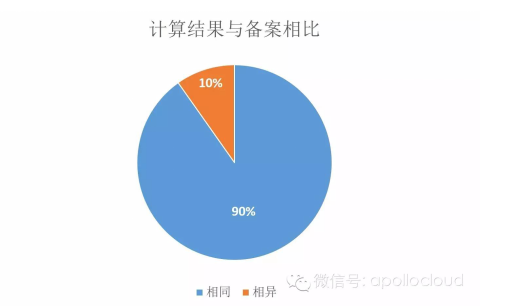 从图中可以看到,计算结果与备案结果相比,有超过90%的相同,在与线下确认之后,发现实际情况与计算结果相同。也就是说,通过对数据的分析与挖掘,我们发现了备案信息与实际情况存在不符。