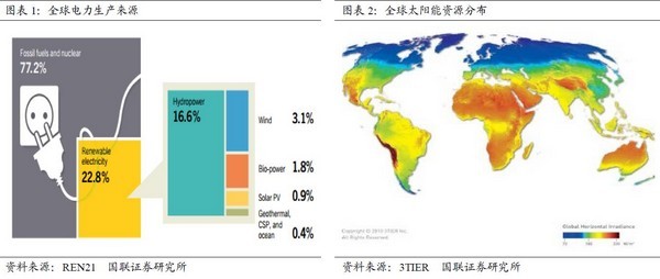 与其他能源相比,太阳能为开发潜力最大但已开发比例最低的能源类型。2014年中,全球仅有0.9%的电力来源于光伏装机,而风电、水电及不可再生能源发电比例分别达3.1%、16.6%和77.2%,光伏目前的开发地位与其巨大的储量地位相悖。