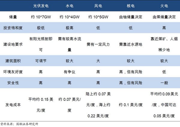 综上所述,光伏发电在储量、投资饱和度、建设地要求、建筑面积、环境友好度、安全性方面都具备优势。