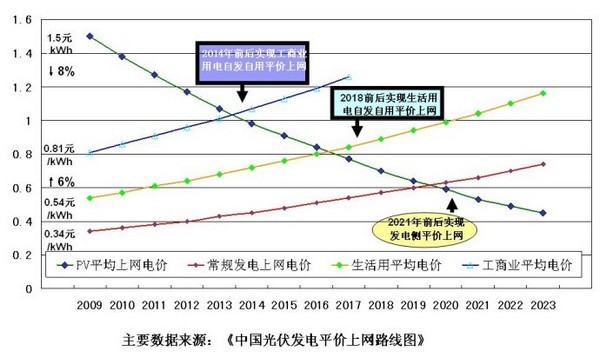 归根结底,光伏产业的发展目前尚受限于每瓦成本。但随着光伏技术的不断进步,光伏发电的度电成本将逐年降低;而一次能源的不断消耗也将抬高传统发电的成本,未来光伏与火电的成本差价将逐步抹平。根据我国资源综合利用协会发布的《中国光伏发电平价上网路线图》,到2020年前后,光伏就将实现发电侧的平价上网,届时可以不依赖于政府补贴,成为具备竞争力的能源。