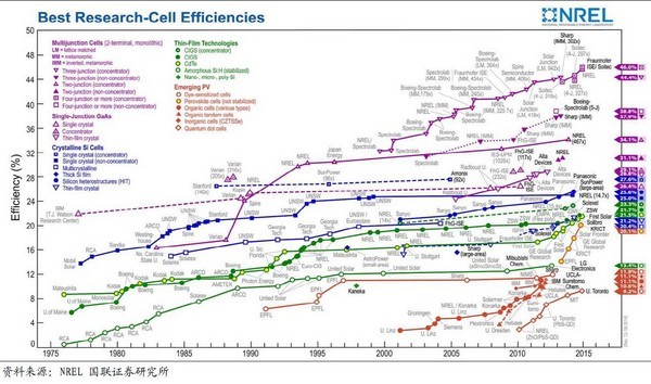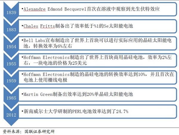 自1839年人类首次发现光伏效应已来,各类半导体材料的使用(Se,Si,CdS,CdTe)、生长工艺的完善(如CZ直拉法、FZ浮区生长法)、制备技术的进步(减反膜、栅线电极、选区发射等技术的应用)使得光伏电池的光电转换效率不断提升,经过100多年的发展达到了目前量产效率17%~20%、实验室效率25%以上的水平。