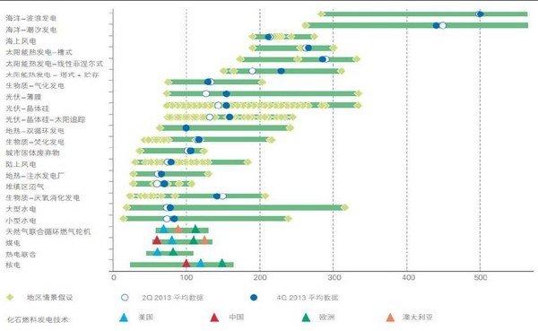 图表13:各发电技术的平准化发电成本(美元/MWh)