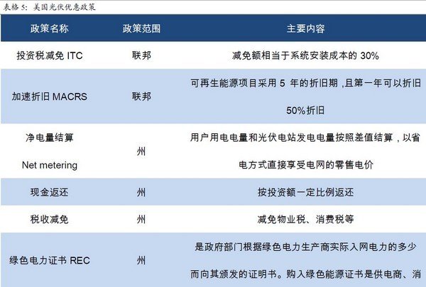 以美国为例,光伏投资商享受联邦政策中的30%投资税减免、150%加速折旧以及各州政策中的净电量结算、补贴等。此外,美国一些州还形成了绿色能源电力证书(REC)交易市场,对光伏能源的本地化发展起到了推动作用。