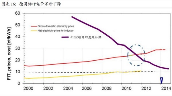 仍然以德国为例,德国2004年对EEG法案进行了首次修改,大幅提高了光伏电站标杆电价的水平,收益率的突升使得资本涌入,带动了当年装机量的快速增长;之后几年德国标杆电价不断下调,且超过了装机成本的下降速度,盈利性的降低使得2005~2008年装机增速减缓;下游需求的降低倒逼中、上游企业改进技术降低生产成本,继而使得电站总装机成本下降。德国补贴的调整虽造成了装机规模的波动,但总体来看引导了全行业成本的下降,并在国内逐步实现了用电侧的上网平价。