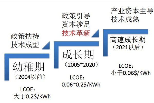 晶硅电池技术的成型、政策力量的扶持与产业资本的涉足帮助光伏行业度过了幼稚期及成长初期。目前全球光伏产业已步入成长中后期,其特征为:政府不再盲目加大补贴,而是通过调整补贴维持企业一定的利润水平;产业资本瞄准补贴和优惠政策开始涉足光伏投资,但受限于较高的度电成本(0.06~0.2美元/度),盈利仍主要来源于政府补贴。突破成长期瓶颈的关键在于创新技术的应用,包括高品质晶硅制备技术,新型电池片制备技术,组串式逆变器,聚光、向阳跟踪系统技术等的大规模运用,使得光伏发电的LCOE低于0.06美元/度,达到与火电相当成本的水平。届时,行业将由产业资本主导,并出现数家光伏能源运营商巨头;光伏装机将呈现爆发式增长,成熟的发电与储能技术将使得分布式电站落户全球每一个角落。