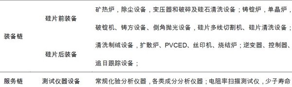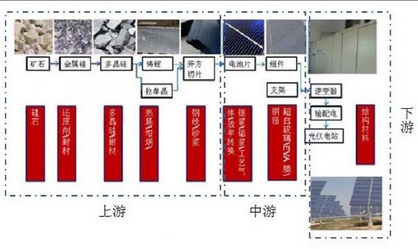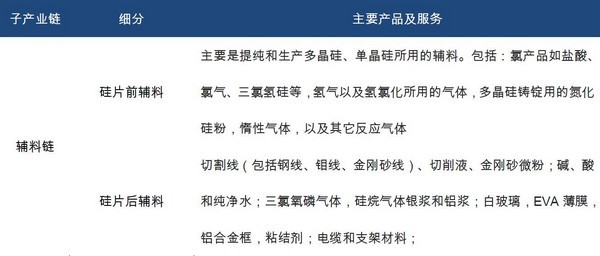 发展至今已形成了从上游的多晶硅料、硅片到中游的电池片、组件再到下游的电站集成、运营的主原料链及其附属的各配套产品、服务子行业。子产业链可细分为辅料链、装备链以及信息服务链,其市场规模已十分巨大。