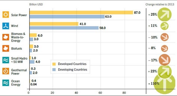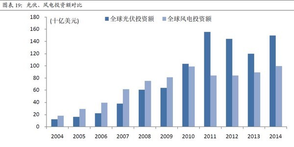 在行业投资规模方面,光伏产业投资已从2004年的120亿美元扩张至2014年的1500亿美元,超过10年10倍的增速。并且从2010年开始,光伏的年投资额第一次超过风电,连续跃居新能源投资之首。从2014年的投资情况看,光伏投资额已超过其余可再生能源投资额的总和(包括风电、生物燃料发电、小型水电、地热能、潮汐能等)。