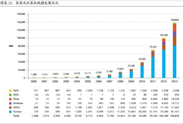 2012年以前,以德国、意大利、西班牙三国为代表的欧洲区域为全球光伏发展的核心地区。截止至2012年底,欧洲装机规模占全球总装机规模的70%。而2013年以后,中国、日本、美国三国接过了欧洲的接力棒,成为主要增长区域。