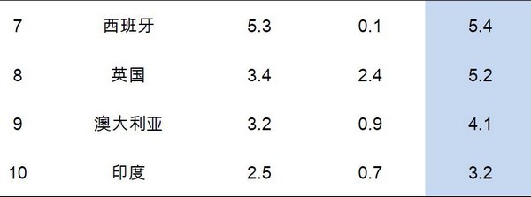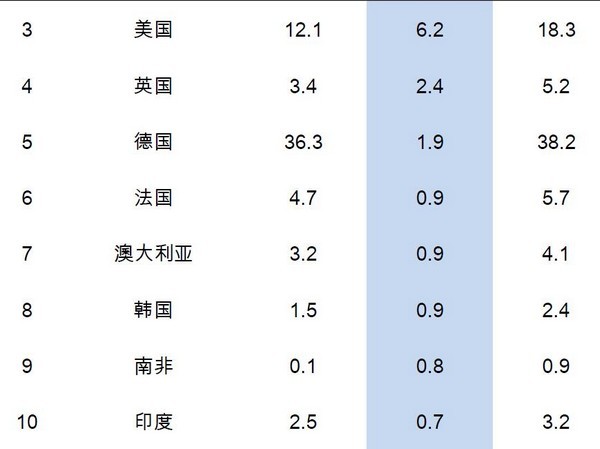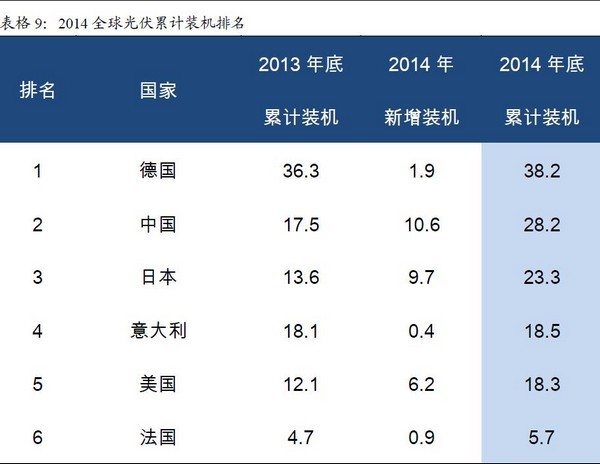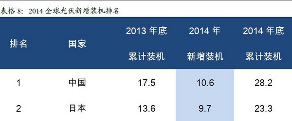 从2014年的新增装机规模来看,中日美英排名前四,均超越了“老大哥”德国。其中,中国和日本为绝对龙头,两国总装机超过了全球新增40GW中的一半。此外,美国、英国、澳大利亚、韩国等发达国家增长势头也很强劲。发展中国家中(除中国外),南非和印度成为了最有潜力的新兴市场,分别新增0.8GW和0.7GW。曾经的龙头意大利和西班牙则比较惨淡,意大利新增0.4GW,西班牙近零增长。