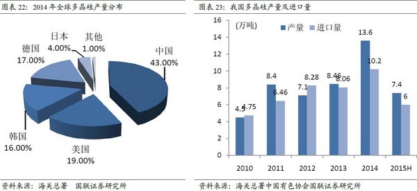 由于国内装机需求的旺盛,多晶依赖进口的局面依然存在,2015年上半年进口6万吨,同比仍大幅增加。在进口地方面,韩国、德国和美国占据了85%的份额。其中韩国以35%居首,主要原因为我国对韩国主要公司征收的反倾销税率较低。