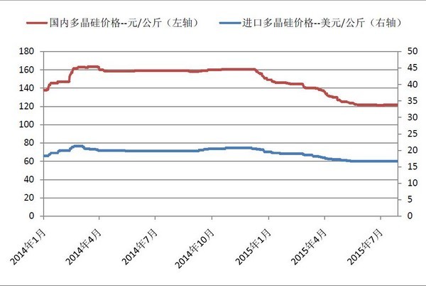 在价格方面,进口多晶硅价格滑落至16.66美元/Kg的水平,现货价格比国内低5~15元/Kg左右,低价对国内多晶硅企业的冲击显而易见。因此国内厂商不得不降价以与进口多晶硅竞争固定的市场份额。如今120元/Kg左右的出厂价使得多数企业挣扎在盈亏平衡点附近,且已直逼国内一线企业的生产成本,形式不容乐观。