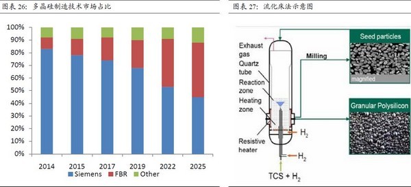 目前,全球多晶硅生产的工艺主要有改良西门子法(Siemens)、流化床法(FBR)、硅烷法、冶金法和气液沉积法。其中改良西门子法为目前的主流方法,占83%的市场份额。根据ITRPV的预计,未来流化床法FBR将逐步取代改良西门子法的份额,因其在成本控制上的潜力。流化床技术与改良西门子法相比,具有如下优点:1.占地少,投资较小,建设期短;2.生产速度快,效率高;生产过程节能,耗电量少;3.可连续,无间断生产;4.产品质量稳定,并可实时检测;5.生产过程实现模块式运行,可根据市场需求调整生产规模。目前流化床法的运行成本已经可以低至12美元/Kg,而根据产业界的估计,在未来3~5年内有望低至7-8美元/Kg。