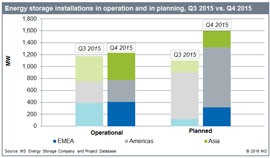HIS主要分析师Marianne Boust评论道:“由于电池成本降低、政府扶持项目和公用事业招标,引发全球储能市场取得快速增长。2015年第四季度全球储市场增长近400 MW。”