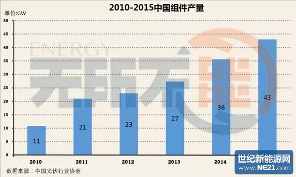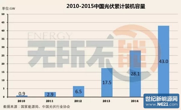 2015中国太阳能发电新增装机创历史新高,累计装机约43GW,累计装机容量已经跃居世界首位。