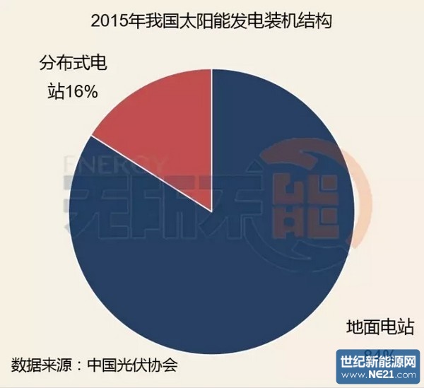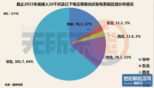 2015年底分布式装机中,华东装机比例最大达64%,301.7万千瓦。