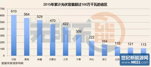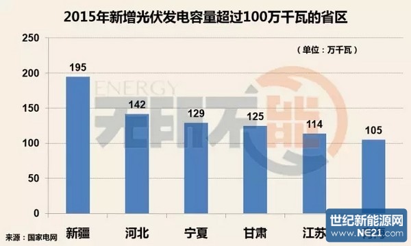 新疆、河北等6个省区光伏装机继续保持增长,2015年这6个省区新增容量均超过100万千瓦。