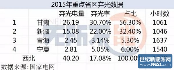 据国网公司研究院人士在会上披露的2015年全国弃光电量的初步统计数据显示:2015年全国弃光电量40亿,总发电量400亿,弃光率约10%。其中国网公司调度范围(不含蒙西)累计弃光电量46.5亿千瓦时,弃光率为12.62%,地区集中在西北地区的甘肃、青海、新疆、宁夏四省区。