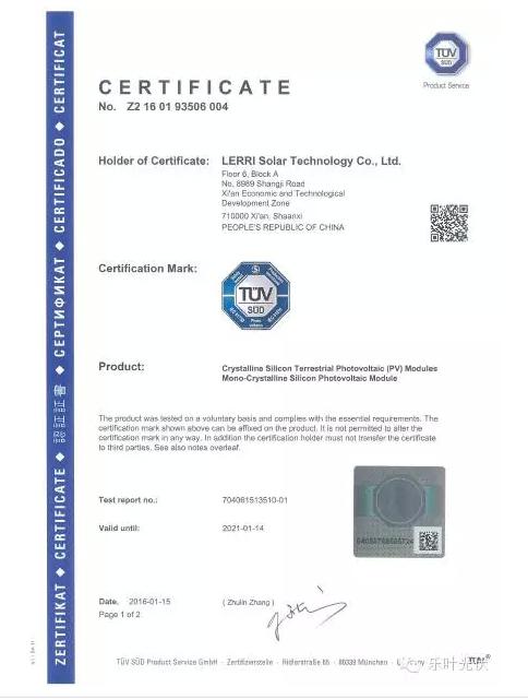 索比光伏网讯:作为国内高效单晶组件龙头,乐叶光伏最近推出了智能组件,并已经获得TÜV SÜD认证证书。