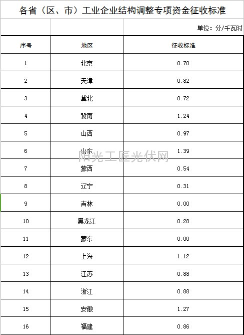 据悉,该资金的征收并不会影响可再生能源发电项目的收益。工业企业结构调整专项资金按各省征收标准,最高不超过1.68分/千瓦时。2015年12月底,国家发改委下发文件,下调全国燃煤发电上网电价和一般工商业用电价格,全国燃煤发电上网电价平均每千瓦时下调约3分钱,同幅度下调一般工商业销售电价,此次电价调整自2016年1月1日起执行。