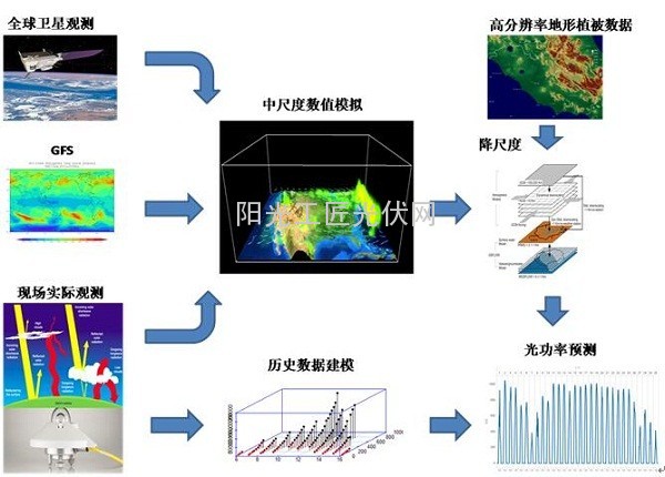 通过对光伏电站运行数据、辐照信息和中长期气象数据的分析、对比及数据挖掘,采用光伏电站局地高分辨率数值天气预报模型,对光伏电站所在区域未来1-3天的气象要素进行预测,同时结合光伏电站历史运行数据的功率预测模型,将数值气象数值模式的预测结果转换成光伏电站的功率输出。