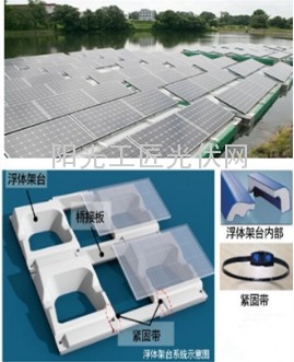 水上浮体太阳能发电系统电:池板、 “浮体架台”;连接架台、 “连接板(桥接板)”和用于固定两者的“紧固带”构成,可在每个浮体架台上,以10度的设置角度一张张安装外形尺寸为宽(1500~1700mm)×进深(980~1000mm)×高(35~50mm)的太阳能电池板。