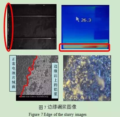 漏浆主要包含边缘漏浆和表面漏浆两种,边缘漏浆是指电池片四周沾到浆料,造成pn型导通,发生漏电如图7所示;边缘漏浆和刻蚀不完全只看IR图像很难区分,必须在SEM或者基恩士下观察方能准确判断。