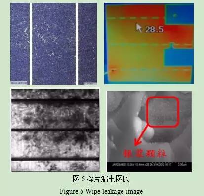 擦片主要是指在印刷过程中出现的印刷不良片用酒精等将栅线擦拭干净后重新印刷的电池片。这些电池片如果没有处理好,可以看到如图6所示的形貌。在显微镜下观察可以看到还有部分浆料残留在硅片表面,IR图像显示有大面积漏电,EL图像显示表面有大面积污染, SEM图像显示可以看到密密麻麻的细点,这些细点即为银浆,在擦片的过程中银浆渗进电池片里;小颗粒银浆是团状银浆在烧结过程中形成玻璃态造成的大面积漏电。