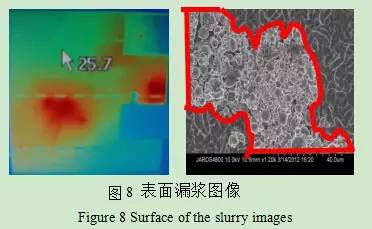 表面漏浆是指电池片在印刷前有隐裂,印刷时隐裂处沾染上铝浆,烧结时铝浆随银浆一起被烧进PN结,而导致PN结被烧穿,引起的漏电如图8所示。平面图上明显看到浆料(红色线条包围的区域),这些浆料以铝浆为主。