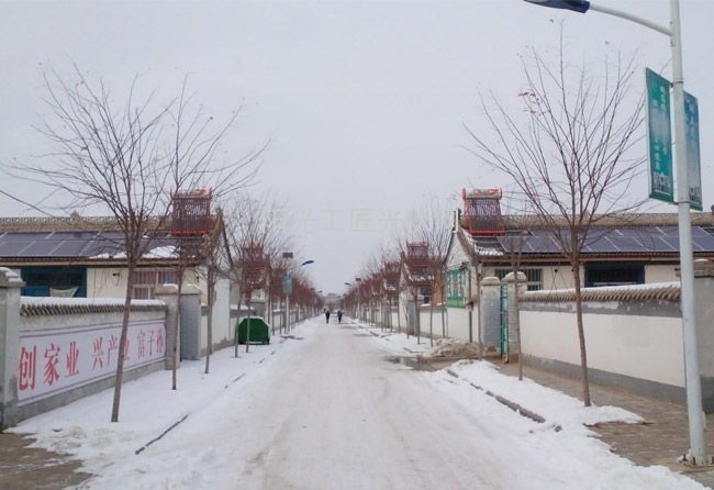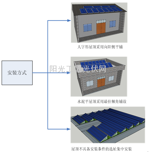 在具有安装条件的屋顶,采用平行屋顶或者最佳倾角方式安装。在不具备安装条件的农户,采用选定合适位置集中安装,然后后平均分配到户。