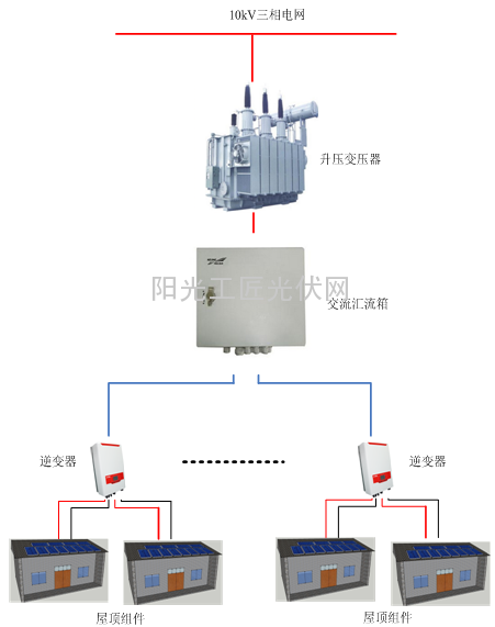 (2)采用将多台逆变器组交流汇流组成大的系统,集中升压并网。