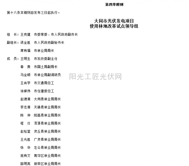 为稳妥扎实做好我市光伏发电项目使用林地改革试点工作,根据《国家林业局关于光伏电站建设使用林地有关问题的通知》(林资发[2015]153号)、《山西省林业厅关于开展光伏发电项目使用林地改革试点的实施意见》(晋林资发[2015]90号)文件精神,市政府研究制定了《大同市光伏发电项目使用林地改革试点的实施细则》,现印发给你们,请认真遵照执行。