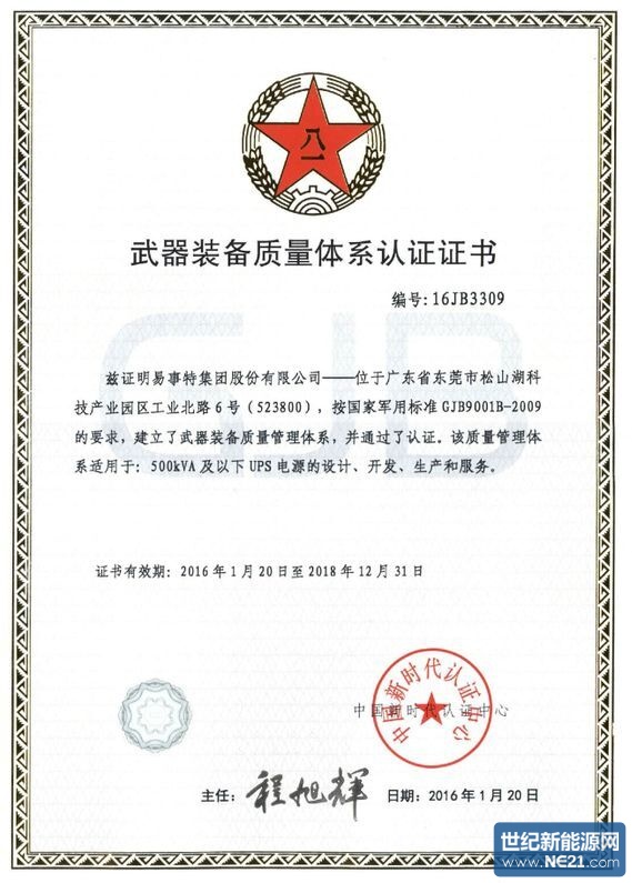为确保产品的功能特性、可靠性、维修性、保障性、测试性和安全性等性能符合质量标准,易事特严格按国家军用标准GJB9001B-2009的要求,建立了武器装备质量管理体系,并通过认证。该质量管理体系适用于:500KVA及以下UPS电源的设计、开发、生产和服务。