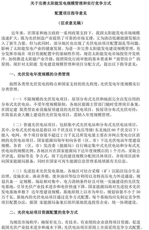 索比光伏网讯:近日,国家能源局下发《关于征求完善太阳能发电规模管理和实行竞争方式配置项目指导意见的函》(以下简称意见)并征求意见。