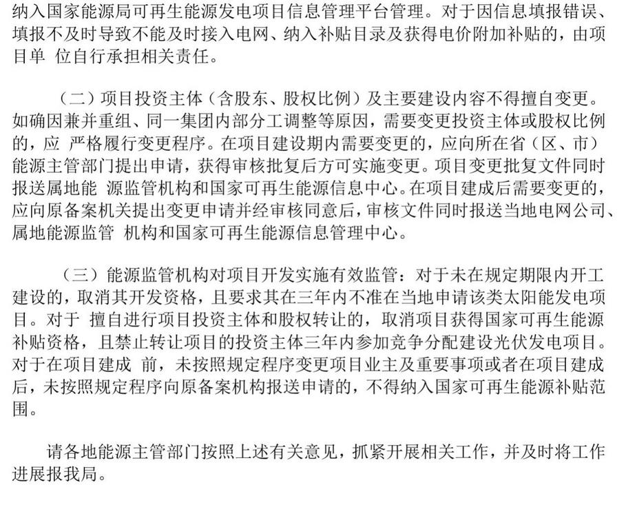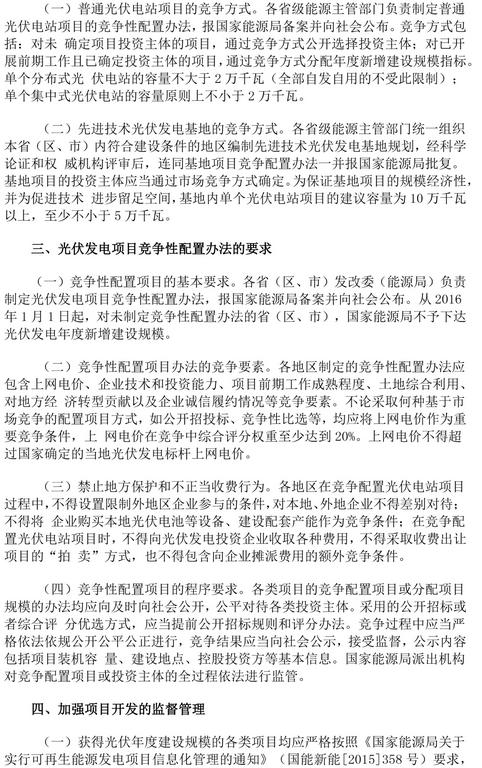 此次《意见》明确了4个方面,其一,按照各类型光伏发电的特点和国家支持的优先程度,光伏发电年度规模实行分类管理。其二,为规范市场秩序,确保有实力、有技术、有业绩的企业获得项目资源,促进我国光伏产业技术进步和成本下降,光伏电站项目原则上全部采用竞争方式配置。其三,光伏发电项目竞争性配置办法的各项要求。其四,加强项目开发的监督管理。