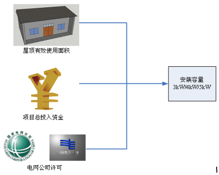 光伏扶贫项目,多以户为单位,综合考虑屋顶可使用面积、项目资金、电网公司的许可来确定每户的安装容量,安装容量多为3kW、4kW、5Kw为主,如宁夏和润村300户光伏扶贫项目,每户以3kw为单位,在其屋顶向阳侧的有效可使用面积可以安装250Wp多晶硅电池板12块,组成3kW系统,采用一台3kW逆变器并网。