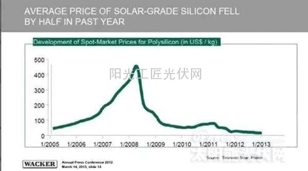 令苗连生万万没想到的是,在六九硅业成立仅几个月后,美国次贷危机就爆发了,进而演变为一场席卷全球的金融危机。大危机之下,多晶硅的价格断崖式暴跌,下跌幅度堪称恐怖。2008年,多晶硅的价格是每公斤300美元;到2011年上半年,跌至每公斤60~80美元;到2012年,更是跌至每公斤12美元,持续至今且有微跌。