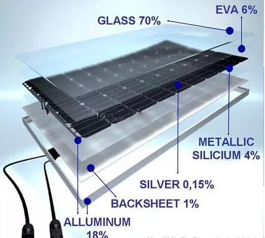 其中成分构成:玻璃70%,导电银浆0.15%,背板1%,铝边框18%,金属硅4%,eva6%。