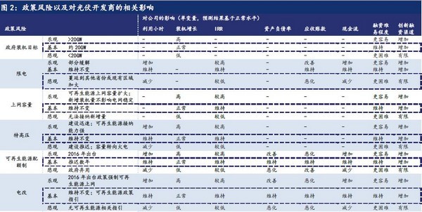 光伏公司面临的问题包括:由于限电问题导致的利用小时数缩减、高负债比,补贴拖欠引发的现金流短缺和应收账款过多,还有投资回报不稳带来的融资困难。而诸如众筹和融资租赁等创新融资方式成本高昂且可持续性有待观察。虽然政府正在推动绿色债券的发展,但是相关的市场前景及准备工作还处于试验期,比如信息披露、绿色项目评估、投资者教育等都需要时间来完善。所有光伏电站开发商都存在资金缺口,资产负债表进一步恶化。我们认为民营企业下,在限电严重的地区,发展靠后的小规模光伏电站厂商在2016年有更大的倒闭风险。