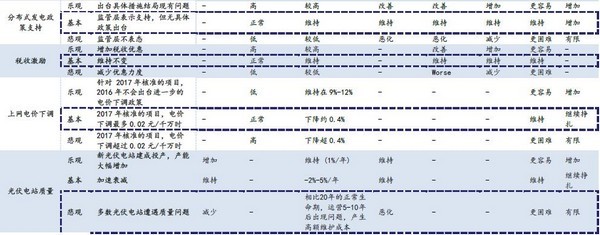 假设其他条件都不变的情况下(包括现建地面式电站7.5元/瓦成本不变),上网标杆电价的下调对光伏项目回报收益IRR的负面影响是显著的。上网电价下调倒逼成本下降,但0.01元/千瓦时的下调对应单位成本降幅预计至少达到约0.1元/瓦才能维持并可能提高公司的盈利能力。