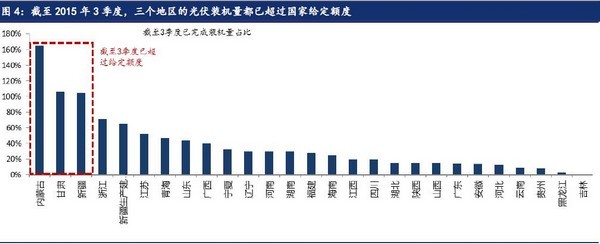 按照各省截止2015年9月并网装机容量来看,新疆(含兵团),甘肃和内蒙古都已经早早地超过了国家给定额度。由于承载这些地区电力输送至需求量大的城市中心的特高压设施仍在建设期,这些省份仍将面临严峻的限电问题。我们预计其他地区,例如浙江和福建,也有可能遇到类似问题。