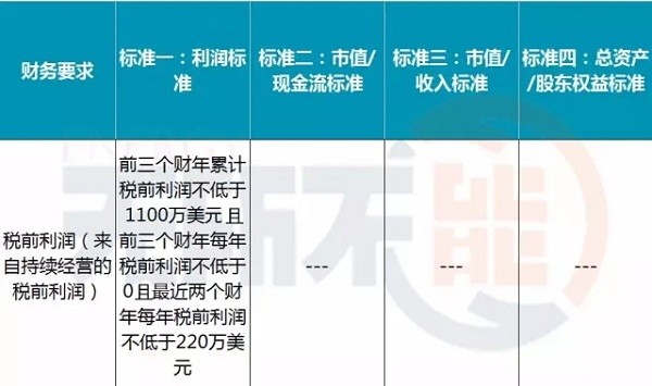 据媒体资料,2011年SEC批准NYSE,NYSEAMEX和NASDAQ三大交易所更新上市规则后,转板上市与IPO的监管尺度基本趋同。据NASDAQ交易所的首次公开发行规则要求,拟上市公司需要分别满足以下任意一个财务标准和流动性标准即可。