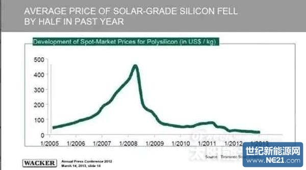令苗连生万万没想到的是,在六九硅业成立仅几个月后,美国次贷危机就爆发了,进而演变为一场席卷全球的金融危机。大危机之下,多晶硅的价格断崖式暴跌,下跌幅度堪称恐怖。2008年,多晶硅的价格是每公斤300美元;到2011年上半年,跌至每公斤60~80美元;到2012年,更是跌至每公斤12美元,持续至今且有微跌。