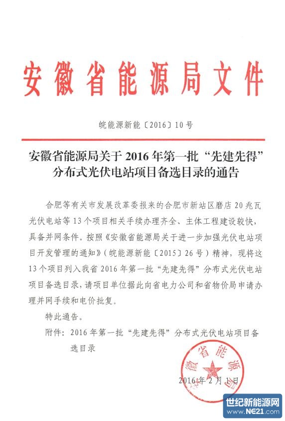 安徽省能源局公布2016年第一批"先建先得"光伏电站备选目录