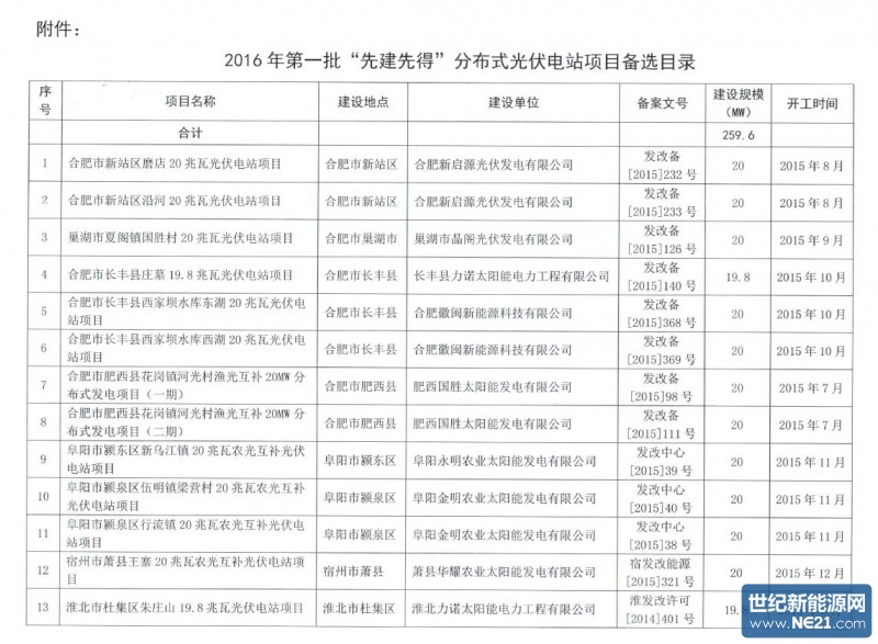光伏电站项目开发管理的通知》(皖能源新能〔2015〕26号)精神,现将这13个项目列入我省2016年第一批“先建先得”