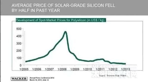 令苗连生万万没想到的是,在六九硅业成立仅几个月后,美国次贷危机就爆发了,进而演变为一场席卷全球的金融危机。大危机之下,多晶硅的价格断崖式暴跌,下跌幅度堪称恐怖。2008年,多晶硅的价格是每公斤300美元;到2011年上半年,跌至每公斤60~80美元;到2012年,更是跌至每公斤12美元,持续至今且有微跌。