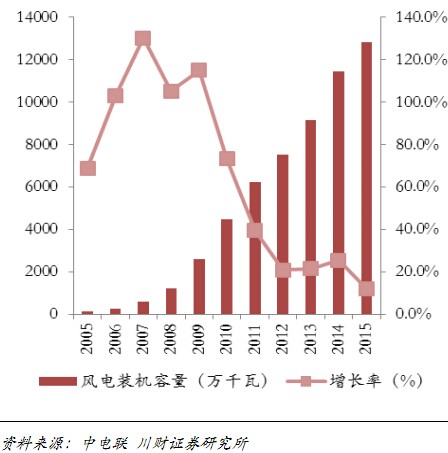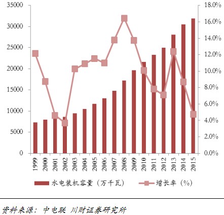 如图1数据所示,进入二十一世纪以来,我国电力装机得到飞速的发展,装机容量直线上升。火电增长了4.5倍,水电增长了4.3倍,风电和光伏更是从无到有,快速发展。但是进入2013年以来,总用电量增速开始放缓,2015年用电更是出现了负增长。而从装机增速上看,火电和水电的增速分别在2006年和2008年达到顶峰,随后增速开始放缓。