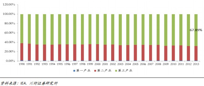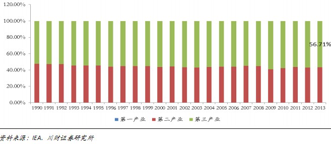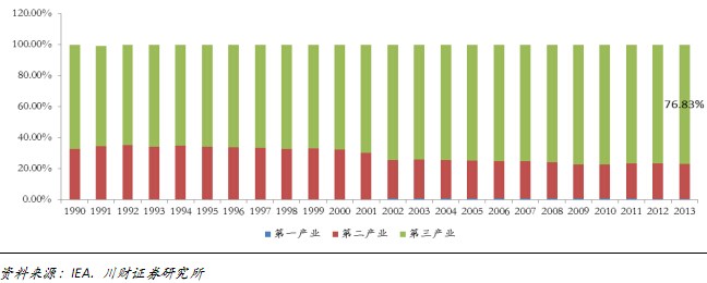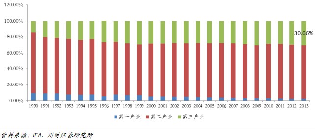 电力装机增速放缓,重点会在旧机组的改建和关停。一是因为环保和效率的要求,比如说有钱了,以前吃粗粮,现在吃细粮,同样对于电来说,也希望用更清洁、更高效的机组。二是用电需求的变化,随着我国经济的发展,第一、第二和第三产业用电结构不断发展,如图9~14所示,参照美、德、英、日、韩的产业用电结构不难发现,发达国家的用电结构具有一定的趋同性,第三产业的占比是最大的,用电需求占比超过60%,而从近几年的变化也可以看出,随着经济的发展和时间的推移,我国的三大产业的用电结构也在逐步向第三产业用电增大的方向调整。